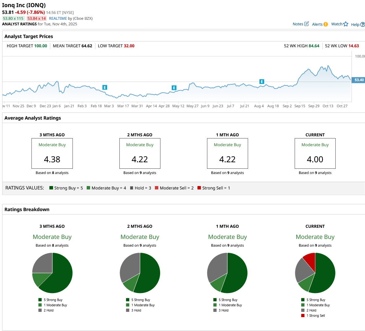Out of nine analysts covering IONQ stock, five recommend “Strong Buy,” one recommends “Moderate Buy,” two recommend “Hold,” and one recommends “Strong Sell.” The average IONQ stock price target is $64.62, which is above the current price of $53.81.