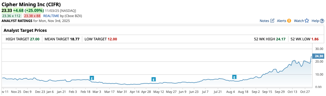 Of course, this current price target may not be reflective of Wall Street's actual opinion of CIFR stock at present, given how hard the stock has rallied over the past couple months. Trading well below $10 per share up until mid-September, Cipher's recent rally indicates significant demand from momentum investors and others like Jane Street that see an opportunity here.