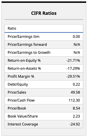 Looking at Cipher's fundamentals above, those negative margin and return on assets/equity numbers are concerning. Bitcoin mining has been a loss-generating business for some time, outside of truly incredible bull markets where Bitcoin doubles over and over. And while that's what some investors may expect to happen in the future, Bitcoin halving events and other factors will lead to margin deterioration over time, with some experts having suggested that it's a mathematically zero-sum game for miners over the very long term.