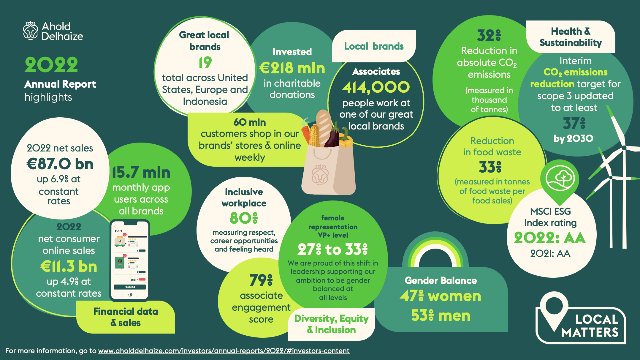 Zaandam, The Netherlands, March 1, 2023 – Ahold Delhaize today publishes its 2022 Annual Report, an integrated report that provides an overview of the Company’s financial and ESG performance in 2022. Reflecting the fact that Ahold Delhaize is a family of great local brands serving millions of customers every day, the theme of this annual report is 'Local matters'. Our brands understand the unique needs of their local communities and customers, and by leveraging the scale and efficiency of a global company, they can offer them best-in-class digital solutions and make sustainable and healthy food accessible to everyone. The report will be on the agenda of the Annual General Meeting of Shareholders (AGM), which will be held on April 12, 2023.