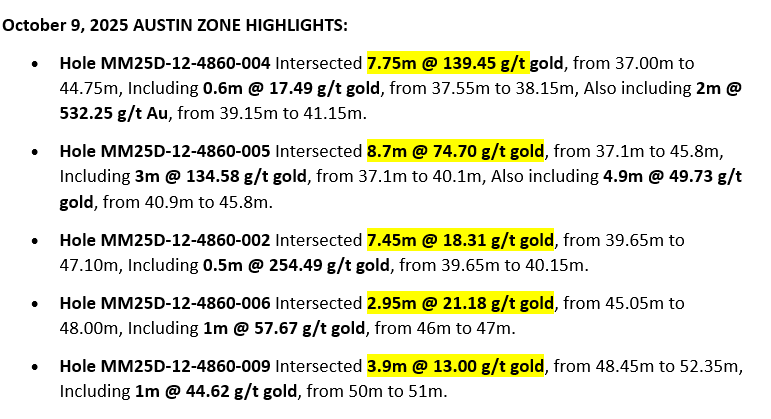 “We anticipate continued success in lower Austin as the drills continue to discover and define more lenses of high-grade mineralization adjacent to our active mine development,” stated Williams in the October 9, 2025 press release.