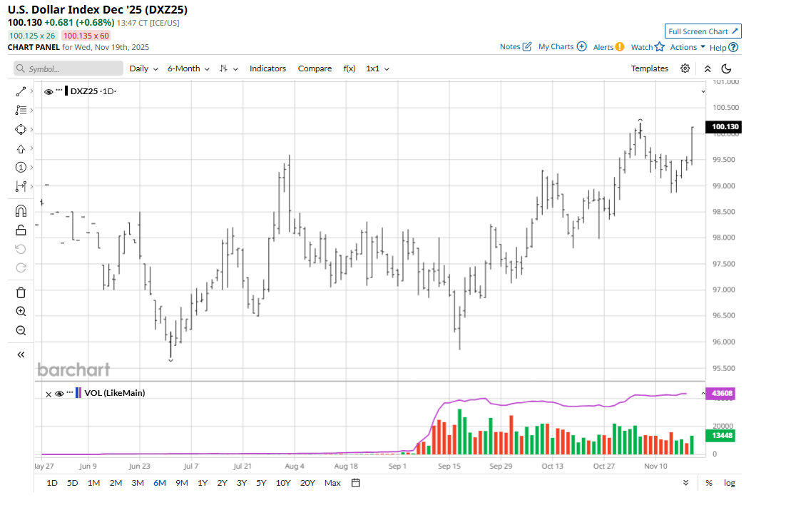 - The Federal Reserve has leaned more hawkish on its monetary policy in the past few weeks. Such has called into serious question whether the Fed will be able to cut the Fed funds rate at its December FOMC meeting. If the Fed stops cutting its interest rate, other major central banks may be likely to do the same. Higher borrowing costs for consumers and businesses are bearish for gold and silver from a demand perspective. A more hawkish Fed is also bullish for the U.S. dollar, which would also be a negative for gold.