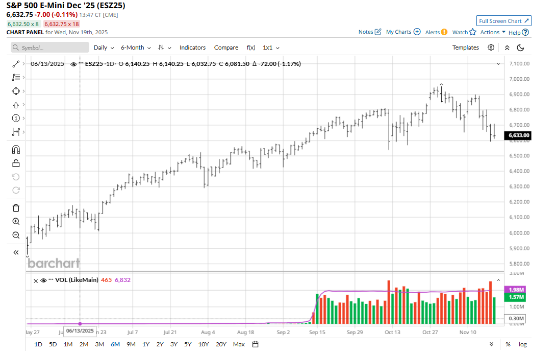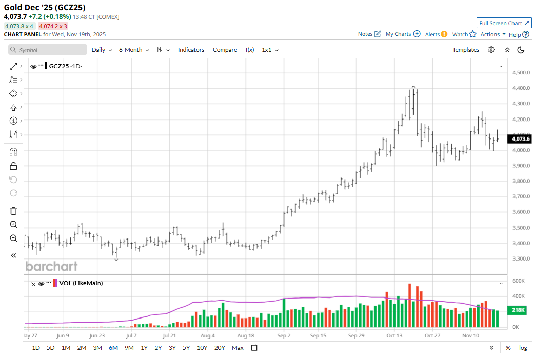 For gold, the next upside target is the record high of $4,398.00 an ounce, basis December Comex futures. Above that it’s $5,000.00. It’s my bias that the $5,000.00 price target could be hit next year. A signal that the gold bulls don’t have the power to continue their record-setting run would be a close in December Comex futures below solid chart support at the late-October low of $3,901.30.