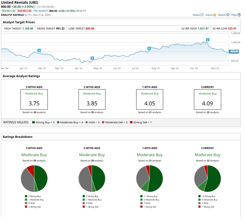 On Nov. 12, Argus Research analyst Kristina Ruggeri raised its price target on United Rentals to $945 and reiterated a “Buy” rating.