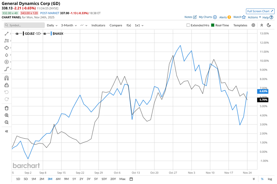 That prominence shows up in its stock performance too. GD stock touched its all-time high of $360.50 on Oct. 24 before cooling off slightly, now sitting 6.2% below that mark. Over the past three months, shares of General Dynamics have climbed 5.8% - a solid run, even if a touch shy of the Nasdaq Composite’s ($NASX6.6% uptick over the same time period.