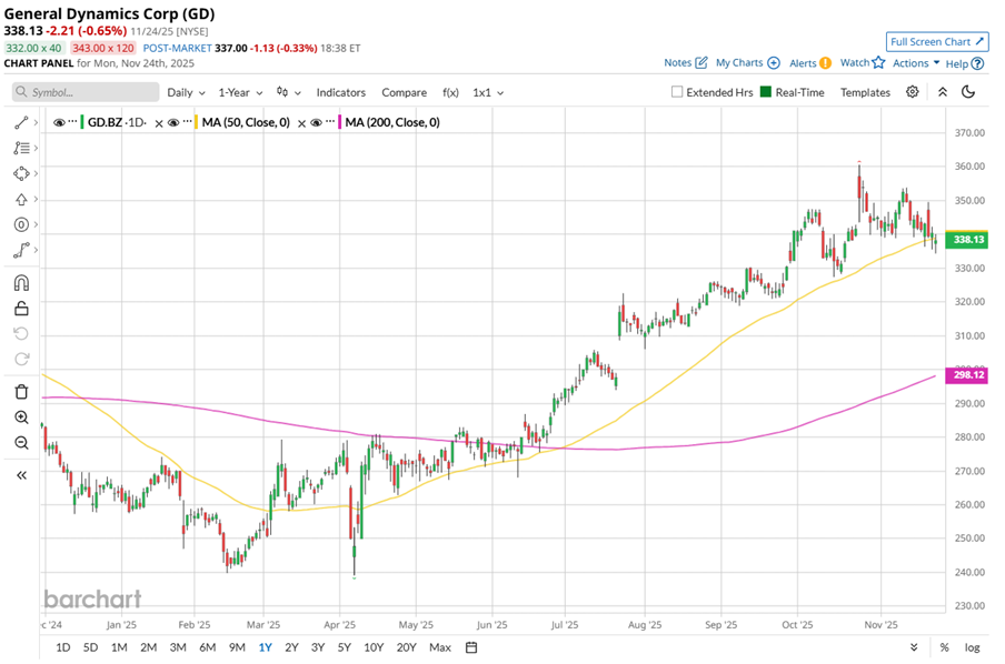 Zooming out, GD’s rally over the past year was impressive. The stock is up 20%, matching the tech-heavy Nasdaq’s momentum. But 2025 has been the real spotlight moment. On a year-to-date (YTD) basis, GD has surged 28.3%, comfortably outpacing the Nasdaq’s 18.4% rise.