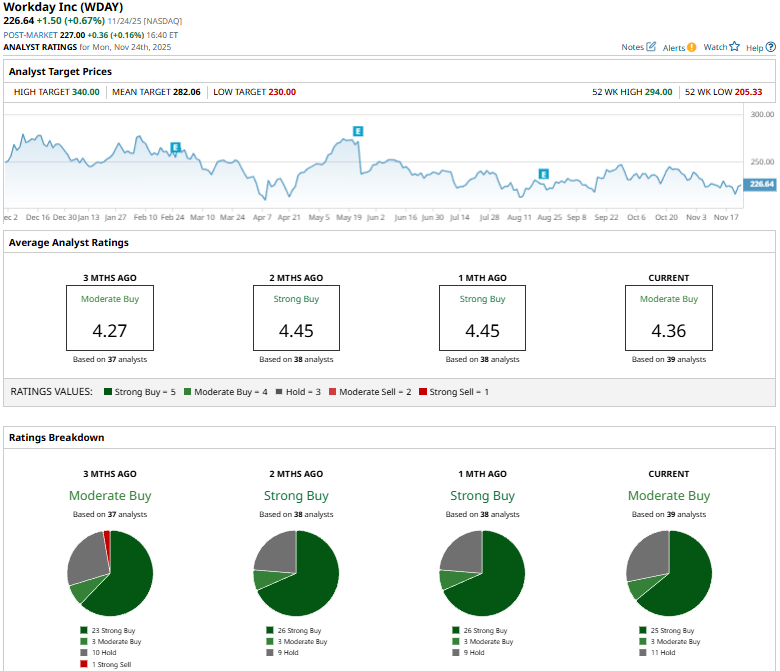 Among the 39 analysts covering the WDAY stock, the consensus rating is a “Moderate Buy.” That’s based on 25 “Strong Buys,” three “Moderate Buys,” and 11 “Holds.”