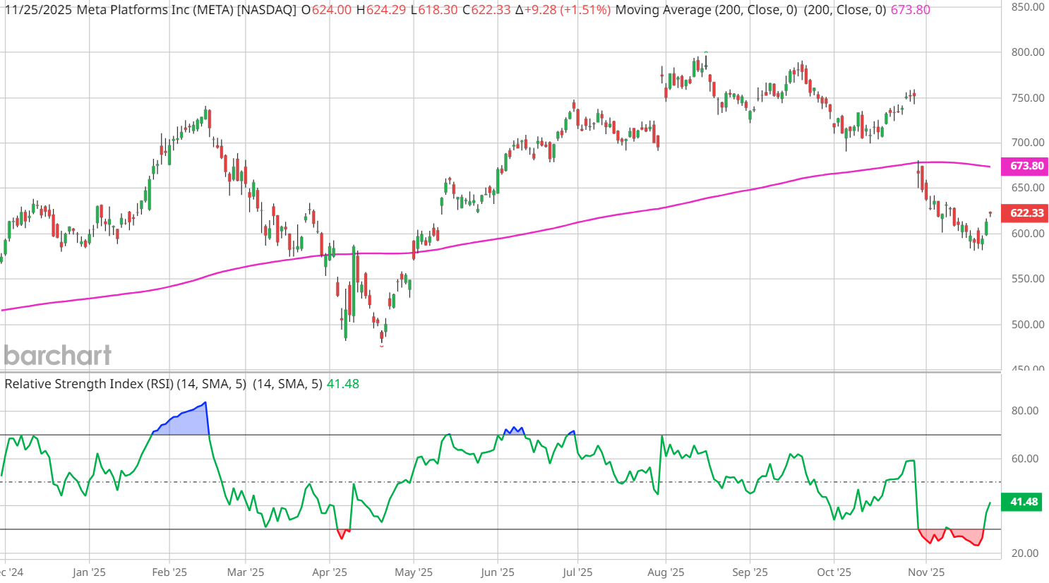 META today is still below that key moving average, meaning the dominant trend is still questionable — even as the stock works out of its deeply oversold RSI status.