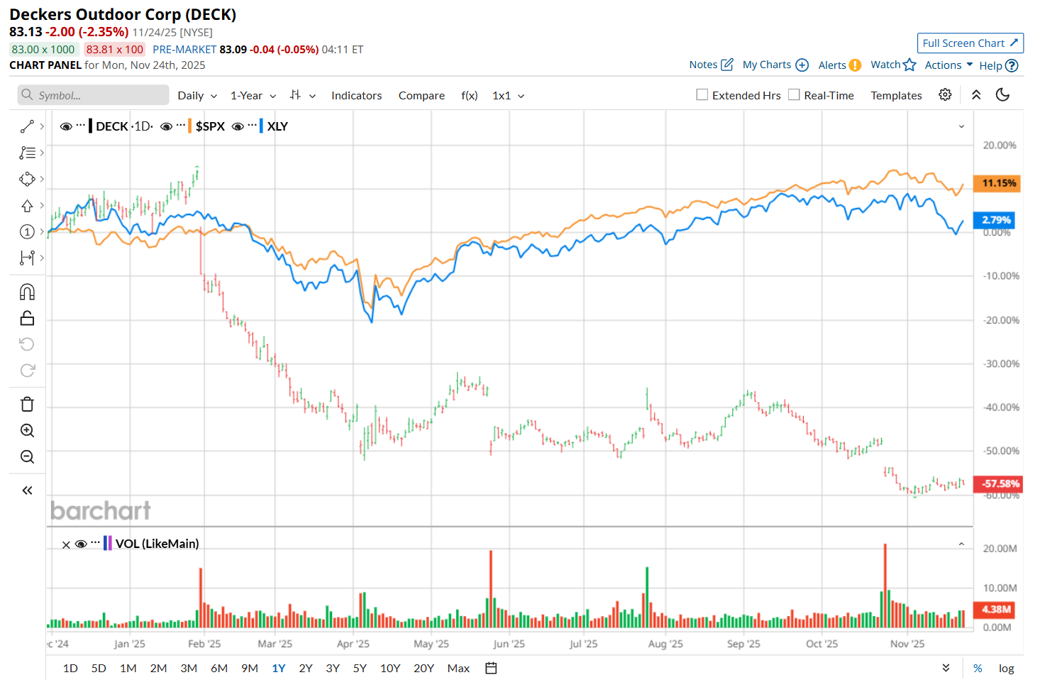 This footwear and apparel company has significantly lagged behind the broader market over the past 52 weeks. Shares of DECK have declined 56.7% over this time frame, while the broader S&P 500 Index ($SPX) has gained 11%. Moreover, on a YTD basis, the stock is down 59.1%, compared to SPX’s 14% uptick