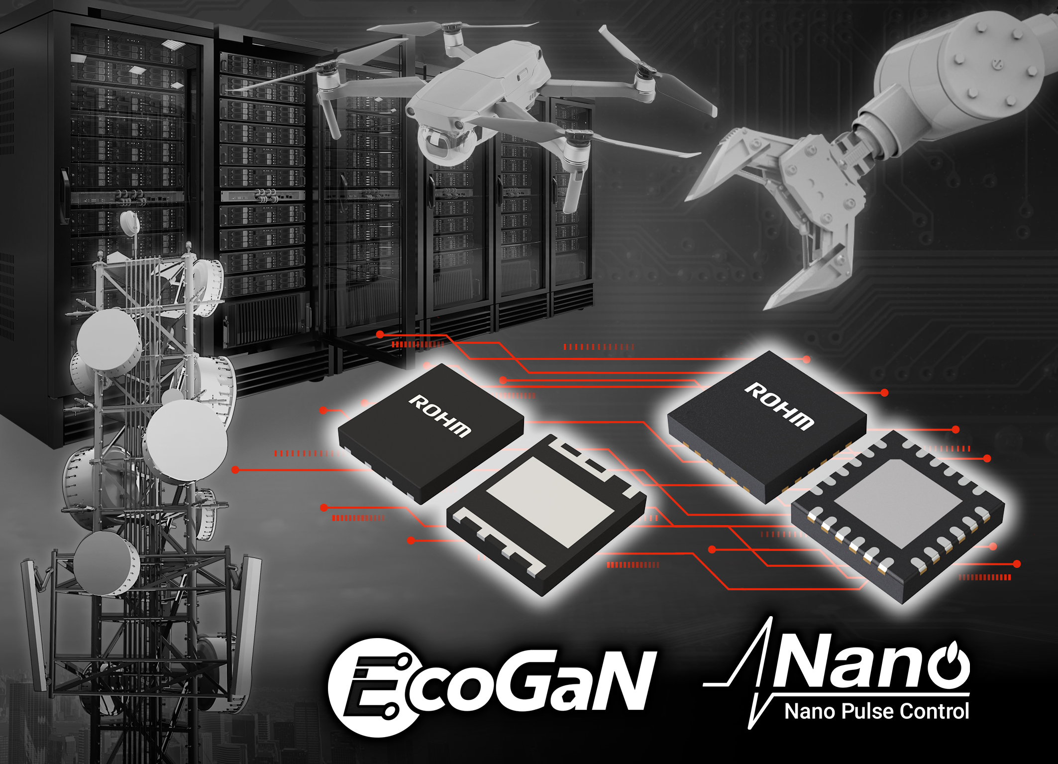 ROHM is currently working to commercialize control ICs utilizing this technology, with plans to start sample shipment of a 100V 1ch DC-DC control IC in the second half of 2023. Using this technology in conjunction with ROHM GaN devices (EcoGaN™ series) is expected to result in significant energy savings and miniaturization in a variety of applications, including base stations, data centers, FA (Factory Automation) equipment, and drones.
