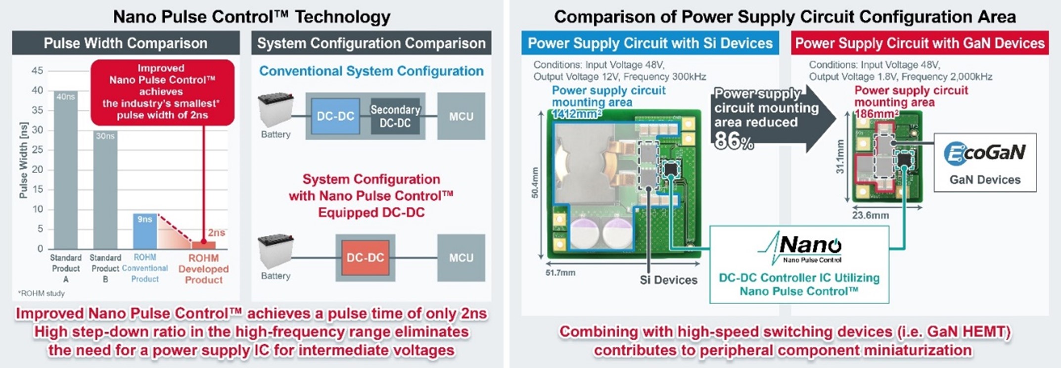 ROHM’s new control IC technology incorporates Nano Pulse Control. It is cultivated by combining advanced analog expertise covering circuit design, processes, and layout utilizing ROHM’s vertically integrated production system. This significantly reduces the minimum control pulse width of the control IC from the conventional 9ns to 2ns using a unique circuit configuration, making it possible to step down from high voltages up to 60V to low voltages down to 0.6V with a single power supply IC in 24V and 48V applications. In addition, support for smaller drive peripheral components for high frequency switching of GaN devices decreases mounting area by approximately 86% over conventional solutions when paired with an EcoGaN power supply circuit.
