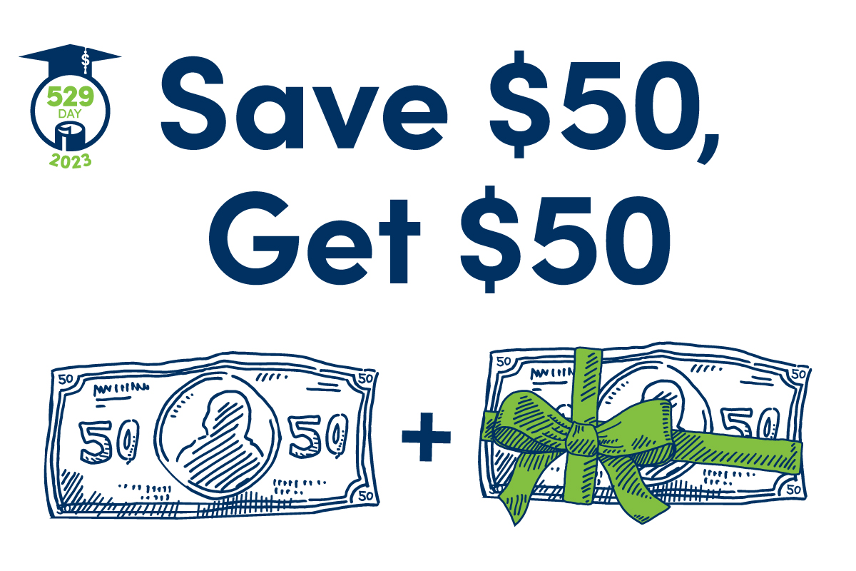 To qualify for the “Save $50, Get $50” offer for yourself or a loved one, open a new Invest529 account by May 31, 2023, establish a recurring bank debit, and contribute $50 or more.