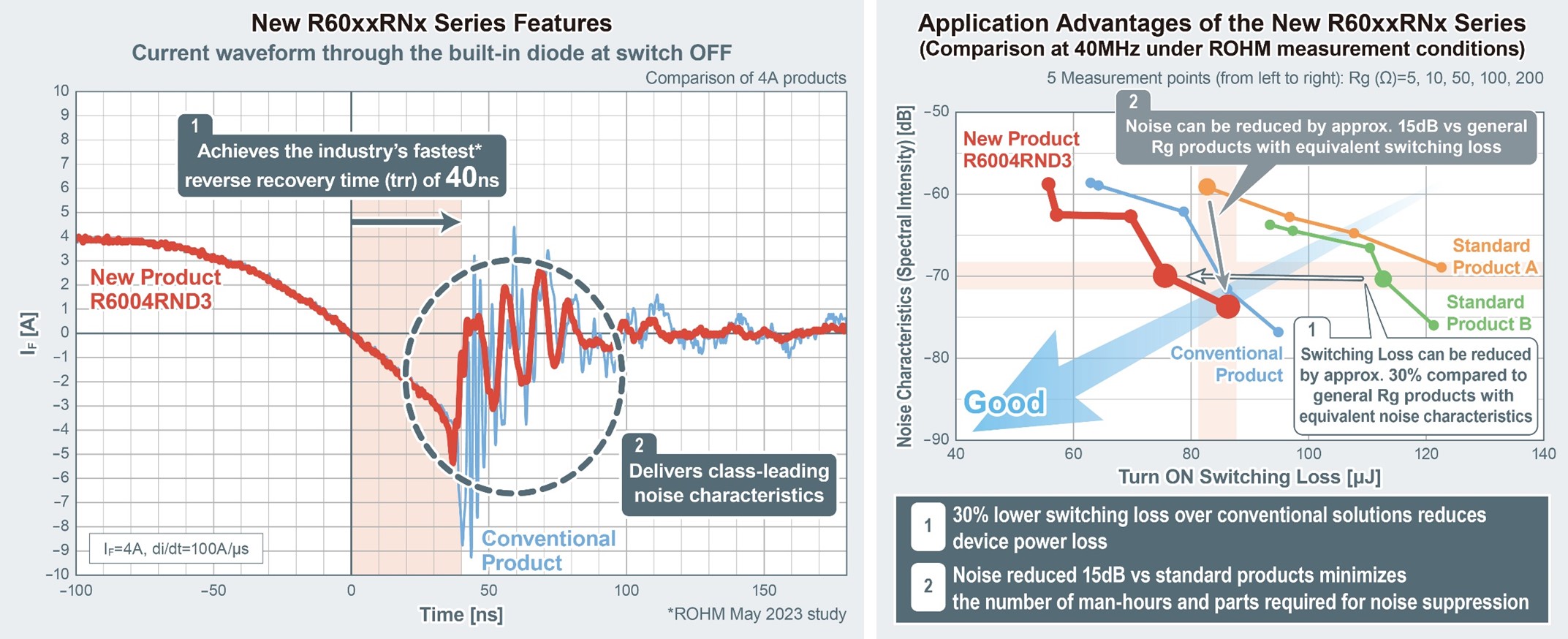 The new R60xxRNx series maintains the high-speed trr characteristics of PrestoMOS while minimizing noise. An industry-best trr of 40ns is achieved by improving conventional lifetime control technology, reducing switching losses by approximately 30% over general products, which translates to lower application power loss. At the same time, the newly developed Super Junction structure reduces noise characteristics (which are inversely related to faster trr) by about 15dB compared to standard products (under ROHM measurement conditions at 40MHz). Delivering industry-leading characteristics reduces the number of man-hours and parts required for noise countermeasures.
