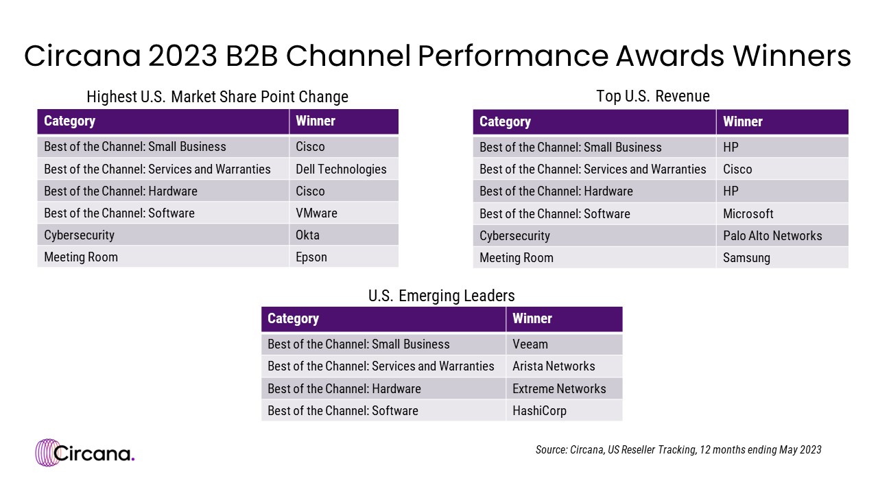 CHICAGO, Aug. 22, 2023 (GLOBE NEWSWIRE) -- Circana, formerly IRI and The NPD Group, has announced the winners of its sixth annual B2B Channel Performance Awards. The awards were given to brands that achieved the top revenue or secured the highest market share point change in the U.S., according to Circana’s Reseller Tracking Service, which tracks sales from the top national solution providers and B2B e-commerce sites in the U.S.  In addition, this year’s newest award category recognized emerging leaders in four B2B segments based on sales growth among brands with annual revenue between $25 million and $100 million.