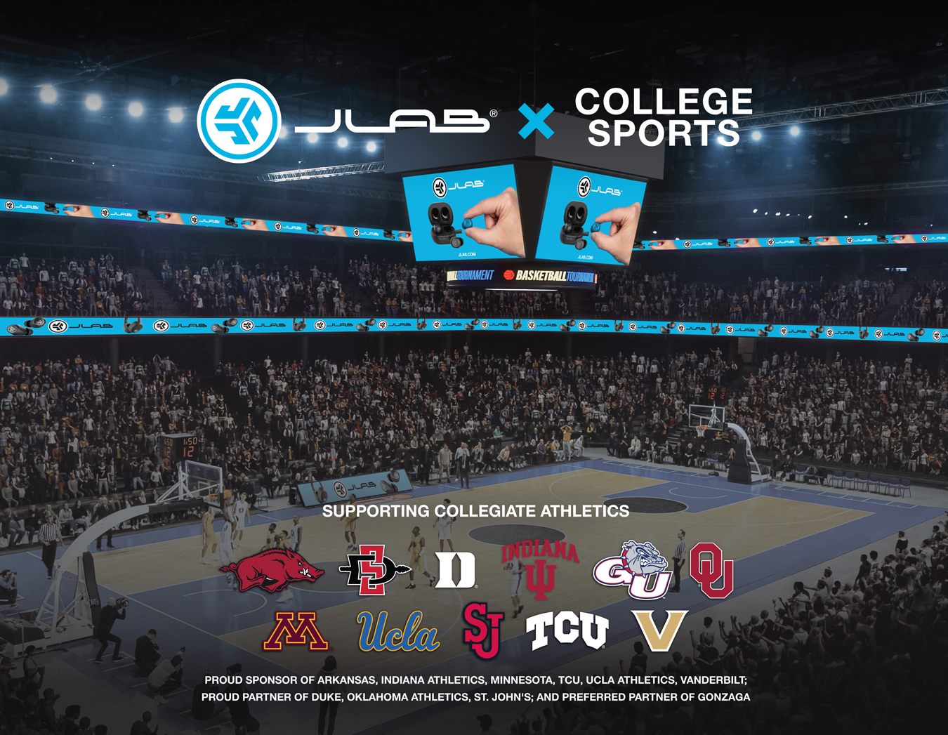 San Diego, CA, Feb. 22, 2024 (GLOBE NEWSWIRE) -- JLab today announced a comprehensive college sports program that will support 17 D1 schools along with student athletes across men’s and women’s sports. The national program partners with UCLA, Duke, Gonzaga, Indiana, Oklahoma, St. John’s, TCU, Vanderbilt, Arkansas, Minnesota – and includes coach’s headsets, in stadium and arena signage, college athlete NIL deals, and fan engagement sweepstakes and more.