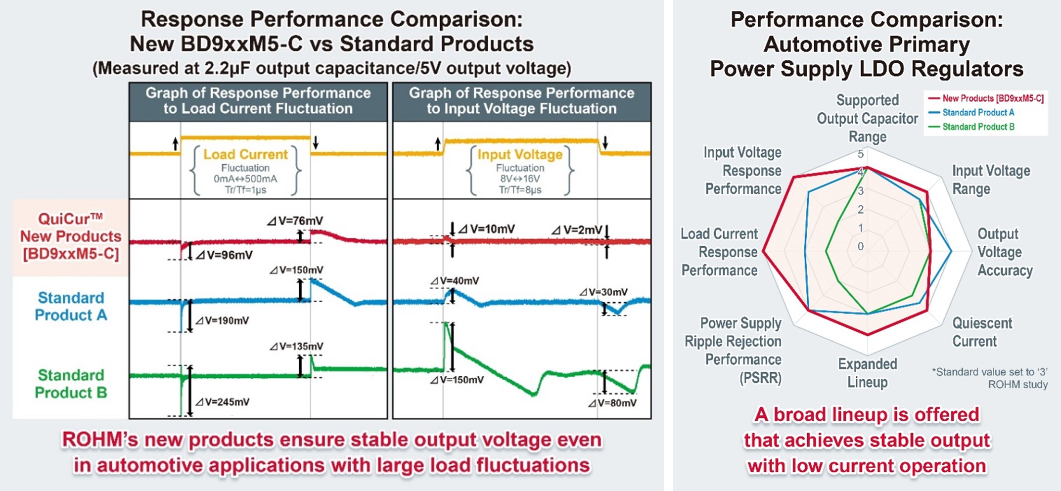 The new BD9xxM5-C meets the basic requirements for automotive products, including 150°C operation and qualification under the AEC-Q100 automotive reliability standard. A wide range of packages will be available to select from depending on the application environment, all featuring excellent response performance and low current consumption using proprietary QuiCur technology.