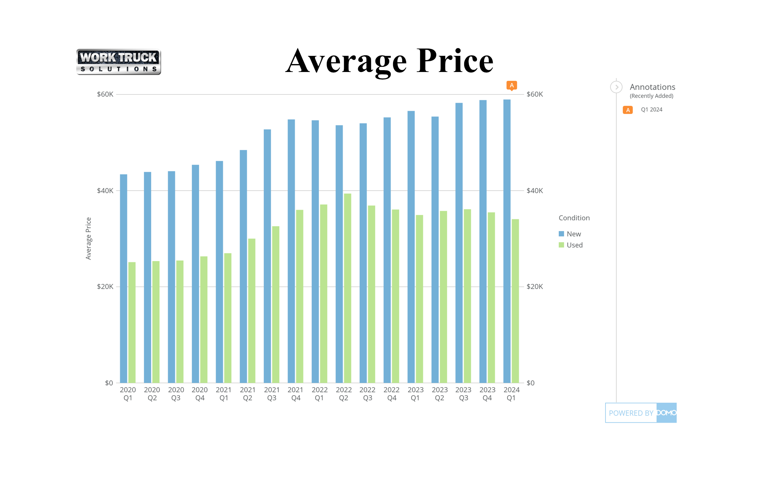 - The latest data reveals average prices for new commercial vehicles are holding relatively steady, with a modest QoQ increase of 0.1% and a slight increase YoY, up 4.2%. However, the Q1 2024 average price of $58,913 is recorded as the highest average price to date.