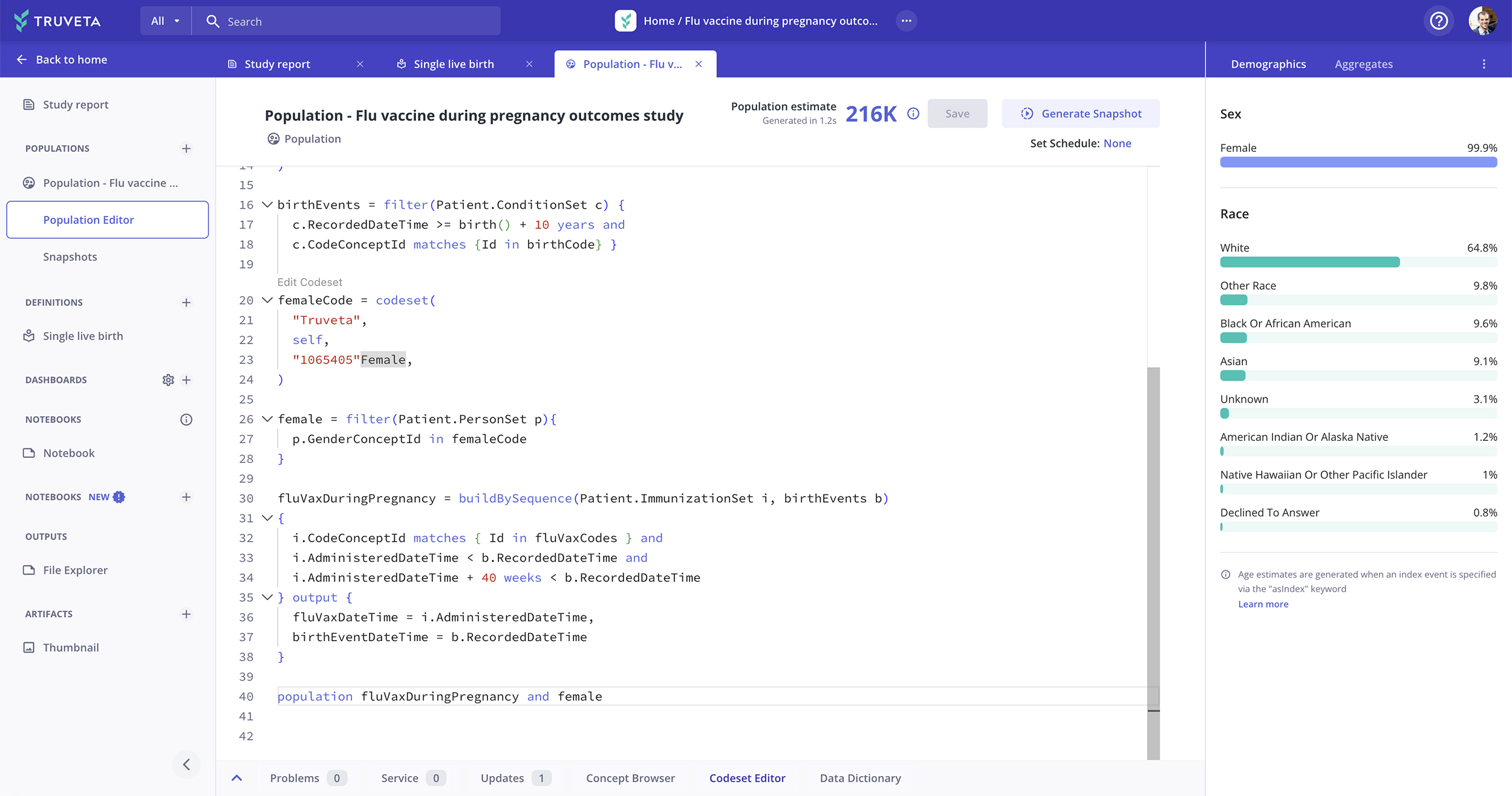 - Exploring a mother-child patient population for which mothers received a flu vaccine during pregnancy to understand virus protection for the child after birth using Truveta Studio