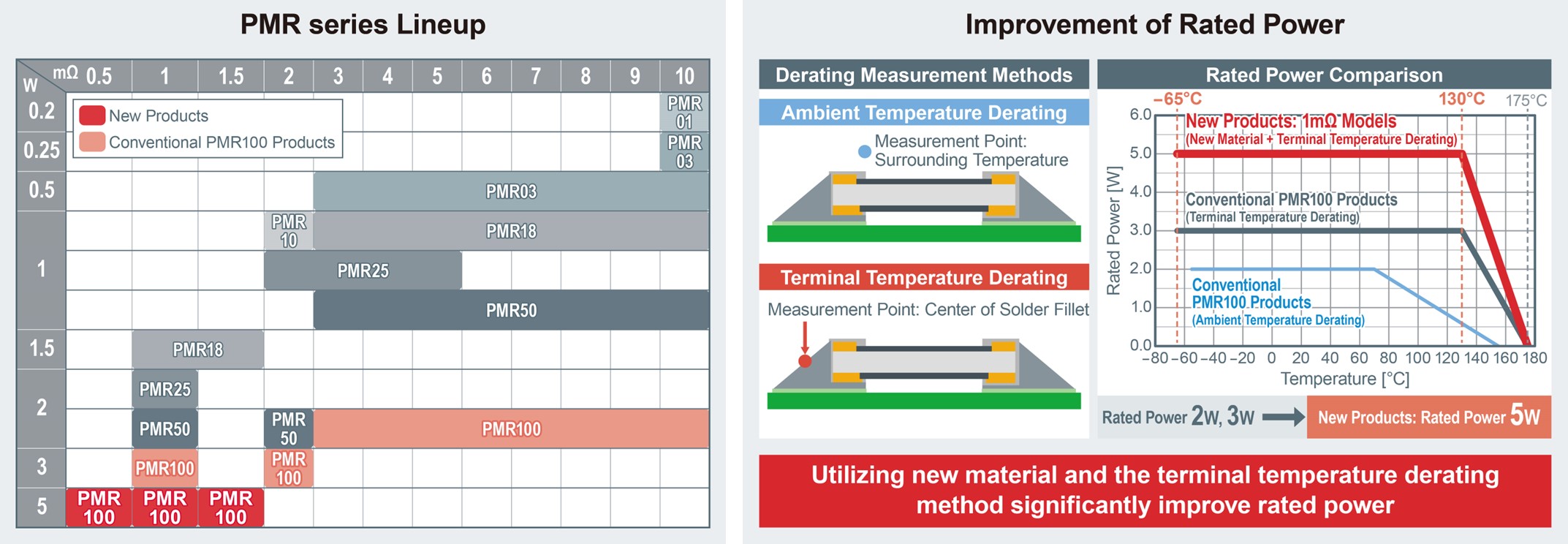 These new products achieve a rated power of 5W by utilizing new materials with excellent temperature characteristics and terminal temperature derating. This represents the best-in-class for 6432-size flat chip types with protective film. Achieving approximately 2.5 times higher rated power than conventional PMR100 2W products and around 1.7 times higher than 3W models means it is possible to replace larger high-power types, contributing to greater miniaturization in a variety of applications. Additionally, a rated terminal temperature of 130°C (for 0.5mΩ and 1mΩ products) and operating temperature range from -65°C to +175°C are guaranteed, ensuring stable operation, even in extreme temperature environments. An excellent temperature coefficient of resistance (TCR) of ±75ppm/°C enables reliable, high accuracy current detection.
